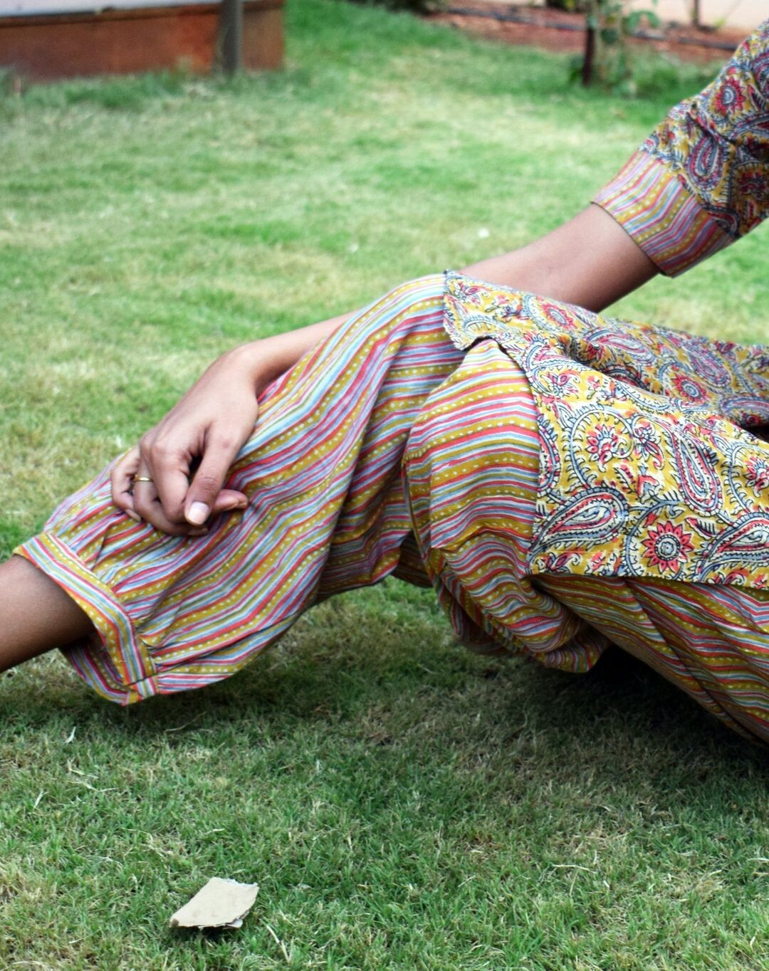 Add a touch of traditional elegance to your wardrobe with Tara's beautiful Kalamkari set! Featuring intricate hand-painted Kalamkari designs, this set is a true masterpiece.